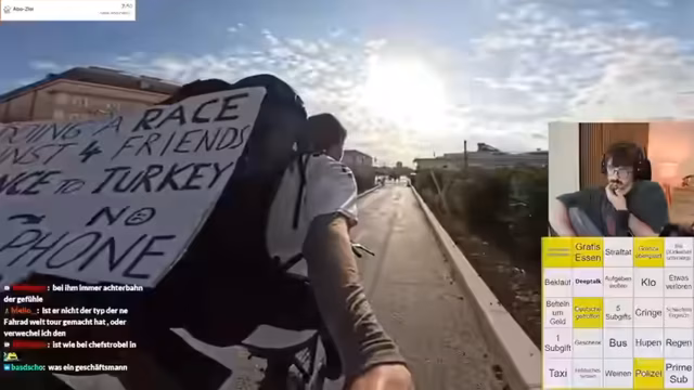 02:53:58Bei einer Zugfahrt mit dem gefundenen Fahrrad kommt es zu einer Konfrontation mit einem Schaffner, der den illegal mitgeführten Radschlüssel bemerkt. Die Situation wird geklärt, indem der Streamer das Fahrrad am Bahnhof zurücklässt. Nach einem Zwischenstopp in einem Ort namens Kirikalle trifft er auf Polizier, was zu einer Verwirrung führt. Letztendlich erhält er eine Mitfahrgelegenheit in Richtung Türkei.