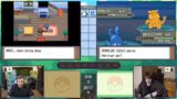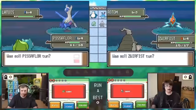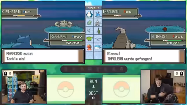 00:21:24Nachdem die Regeln vestellt wurden, beginnt das Gameplay in Pokémon Platin. Die Streamer erstellen ihre Charaktere und benennen sie beide "Jochen", was sie als lustigen und validen Namen ansehen. Sie treffen ihren Professor und erhalten ihre Starterpokémon, Relaxo und Azumarill. Beide sind sich unsicher über die Qualität der Starter, besonders da Relaxo auf den ersten Blick nur schlafen kann. Sie nutzen eine Glücksphase im Spiel, um ein Pokémon zu fangen, jedoch endet der erste Kampf tödlich für eines ihrer Pokémon.