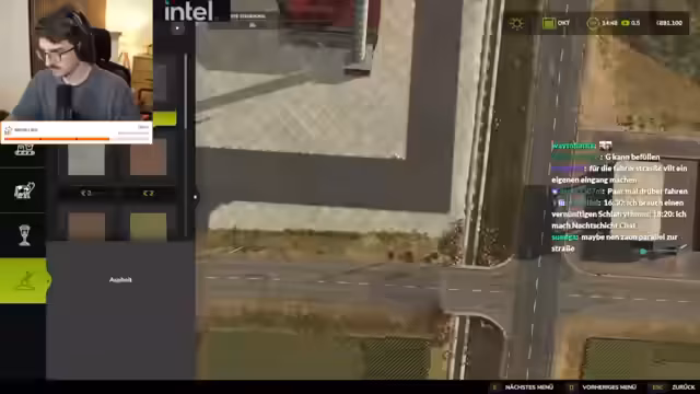 01:47:23Zu Beginn des Streamings stellt der Streamer fest, dass er vergessen hat, die Spurhalter anzumachen, was ihn zu einer erneuten Durchfahrt zwingt. Anschließend diskutiert er mit G-Time die Aufteilung der Bauprojekte auf dem Server. Während G-Time den Hof bauen soll, plant der Streamer ein ausgedehntes Fabrikgelände für Baumwoll-, Zuckerfabriken und ein großes Silo, um den bevorstehenden Besuch von Max vorzubereiten und dessen Content-Wünsche zu erfüllen.