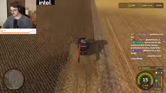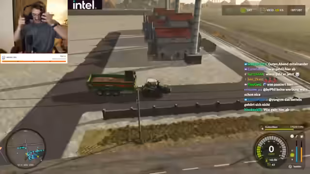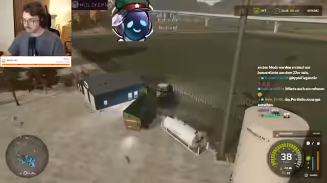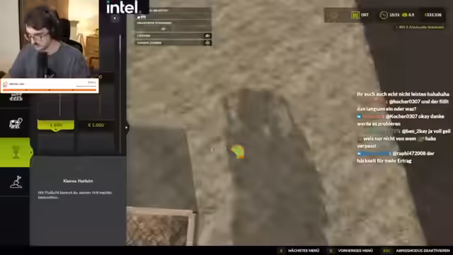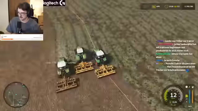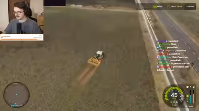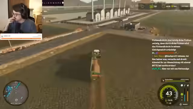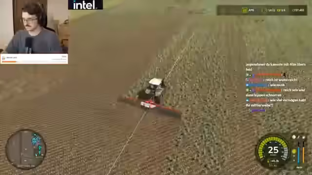 00:35:16Während des Spiels treten wiederkehrende technische Probleme auf, sogenannte "Flecken" auf den Feldern, deren Ursprung im Chat heftig diskutiert wird. Theorien reichen von "Aliens" über "Mottenmännern" bis hin zu "Hagelschäden". Der Streamer leitet diese Diskussion, interagiert mit der Chat-Community und nimmt deren Anregungen auf. Gleichzeitig wird die Gameplay-Mechanik der KI-Führung für landwirtschaftliche Maschinen thematisiert und ihre Effektivität in Frage gestellt.