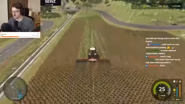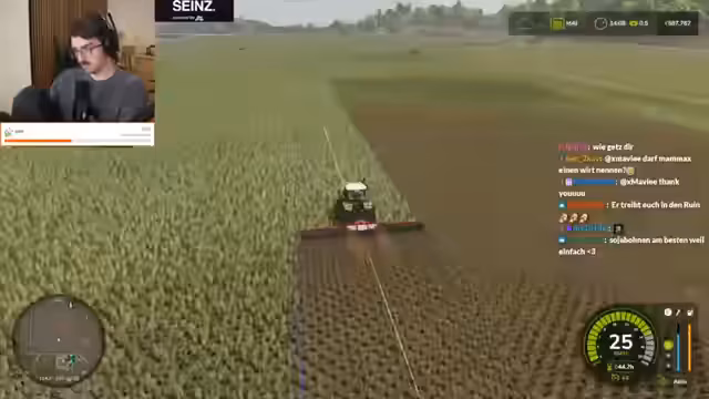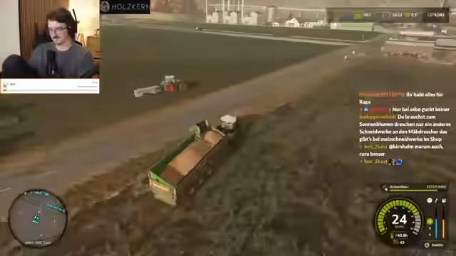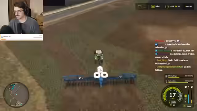09:33:38Die Konzentration liegt wieder auf dem Landwirtschaftssimulator, wo erfolgreich Sonnenblumen gepflanzt und gedüngt wurden. Der Streamer plant, sich vom Spiel zurückzuziehen, ist aber von der anstehenden Ernte begeistert. Es wird über die Effizienz von Maschinen gesprochen und ein Drescher wird positioniert. Die lange Erndauer führt zu einem philosophischen Austausch über den idealen Schlafrhythmus und die Balance zwischen Stream-Zeiten, persönlichen Verpflichtungen und der Notwendigkeit, online präsent zu bleiben, um Zuschauer zu binden.