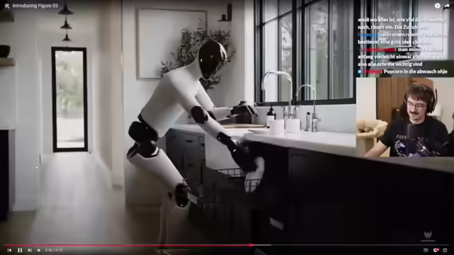 00:13:58Der Fokus richtet sich auf Zukunftstechnologien, insbesondere Haushaltsroboter. Es wird ein utopisches Bild von Robotern gezeichnet, die den Alltag erleichtern, inklusive Kaffee servieren. Die Diskussion dreht sich um die Kosten und die potenzielle Verbreitung solcher Roboter, wobei spekuliert wird, dass diese nicht nur Superreichen vorbehalten sein werden. Es wird auch die Möglichkeit von Gebrauchtmärkten und Abo-Modellen für Roboter angesprochen. Ein weiteres Thema ist die Entwicklung von KI und deren Einsatz im Alltag, beispielsweise bei der Frage, wo Gegenstände im Haushalt platziert werden sollen. Abschließend wird ein Video über Tesla AI und Mr. Beast erwähnt, wobei letzteres in einer deutschen Synchronisation angesehen wird, um den humoristischen Wert zu steigern.