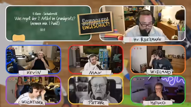 05:19:19Die finale Frage in der achten Klasse stellt den zweiten Artikel des Grundgesetzes in den Mittelpunkt. Die Teilnehmer müssen mindestens einen Punkt benennen. Nach der Auswertung der Antworten scheiden wichtige Teilnehmer wie Kevin, Wieland und Max aus, da ihre Antworten wie 'Freiheit' oder 'Gewaltenteilung' nicht den gesuchten Inhalten des Artikels entsprechen. Lediglich Heiko bleibt vorerst im Spiel, nachdem er 'Würde' als Antwort gab, was aber ebenfalls nicht ganz korrekt ist. Dies markiert das vorläufige Ende des interaktiven Teils des Streams.