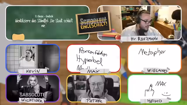 04:28:32Der Stream startet mit einem Quiz zur deutschen Grammatik. Der Streamer stellt die Frage nach der Wortart des Wortes 'schneller'. Nach anfänglicher Verwirrung und Diskussion über mögliche Antworten wie Adjektiv oder Komparativ, wird der Komparativ als richtige Lösung bestätigt. Dies ist der Auftakt für eine Reihe von Quizfragen im Stile eines Schulunterrichts, bei dem die Teilnehmer interaktiv Antworten eingeben müssen.