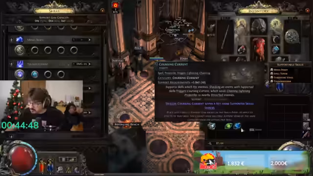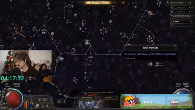 10:02:19Der Respec wird vollzogen: Der Skillbaum wird komplett zurückgesetzt und neu auf Kritische Chance, Schaden und Manaproduktion ausgerichtet. Items wie 'Lion Fate' werden eingesetzt, um Defensivwerte zu verbessern. Die ersten Maps mit dem neuen Build verlaufen erfolgreich – Pflanzen liefern konstanten Schaden, und Bewegungsoptionen erhöhen die Spielspaß-Erfahrung. Gleichzeitig wird die Charity-Aktion final beworben, mit dem Hinweis, dass die 2000-Euro-Marke noch erreichbar sei. Der Streamer zeigt sich zufrieden mit der Entscheidung und plant, den Build weiter zu verfeinern.