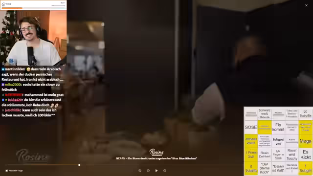 01:36:45Der Streamer schaut eine Rosin-Folge, in der es um das Star Blue Kitchen und das Primavera in Weiden in der Oberpfalz geht. Claudia hat Frank Rosin gerufen, weil beide Restaurants nicht laufen. Ihr Mann ist seit sieben Jahren selbstständig und hat das Café-Restaurant immer weiter gehabt. Die Straße war wegen Bauarbeiten ein Jahr lang aufgerissen, was die Geschäfte beeinträchtigt hat. Der Mann hat die Einnahmen nicht und es ist kein Personal da. Er ist hochverschuldet. Claudia hat ihm schon finanziell geholfen, indem sie ihm die Miete überwiesen hat. Sie sieht das als letzte Chance, weil sie sonst beziehungstechnisch kein Land mehr sieht. Er ist nie da und sie können nie was gemeinsam machen. Er steht in der Früh um 7, 8 da drin, bis 16 Uhr und um 16 Uhr geht er ins Primavera. Und nachts, wenn sie schon im Bett ist, ist er im Wohnzimmer und weint. Ihr Mann möchte die beiden Geschäfte aufbauen, weil er irgendwann ihren Sohn dort integrieren will. Ihr Sohn Arjan ist 13, wird 14 und hat eine Sprachentwicklungsverzögerung und Motorikprobleme. Sie wünscht sich, dass jemand weint, damit das Bingo erfüllt ist. Sie schaut sich die Situation an und überlegt, wie sie da weitermachen können.