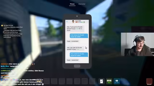 01:44:35Die Akquise neuer potenzieller Kunden und Dealer schreitet voran, stößt aber auf Herausforderungen. Ein Deal mit einem Kunden wird durch einen Fehler des Streamers sabotiert, da er zu gierig ist und dem Kunden mehr Drogen verspricht, als im Rahmen eines kostenlosen Samples üblich ist. Dies führt zu Frustration und untergräbt das Vertrauen in die Geschäftsbeziehung.