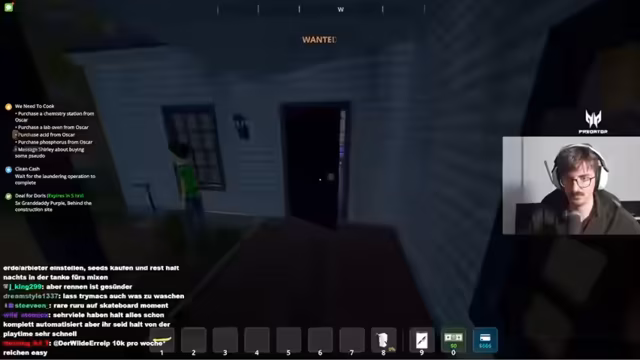 03:34:45Der Alltag im Drogenring ist von vollen Lagerhäusern und überlasteten Dealern geprägt. Um die Ausgaben zu kontrollieren, werden Mitarbeiter bezahlt und neue Rohstoffe bestellt. Währenddessen eskaliert die Situation, als der Streamer bei einem Straßenverkauf gesucht wird und eine heftige Verfolgungsjagd mit der Polizei beginnt, bei der er nur knapp entkommen kann.