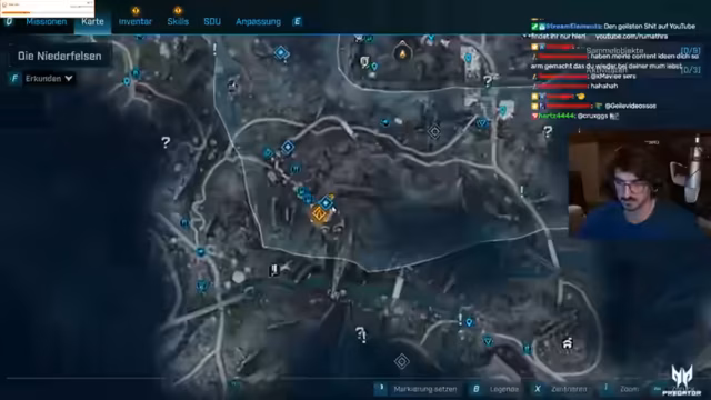 00:05:15Die Konzentration liegt auf der Hauptmission. Streamer sucht vergeblich nach einer NPC namens 'Blotch', um eine Mission abzuschließen, was ihn verärgert. Beim Betreten einer Kluft werden Probleme mit der Munitionsversorgung deutlich. Die Suche nach legendären Waffen ist das primäre Ziel, auch wenn die Drops zunächst enttäuschend ausfallen und die legendären Gegenstände seltener und dadurch wertvoller wirken als im Vorgänger.