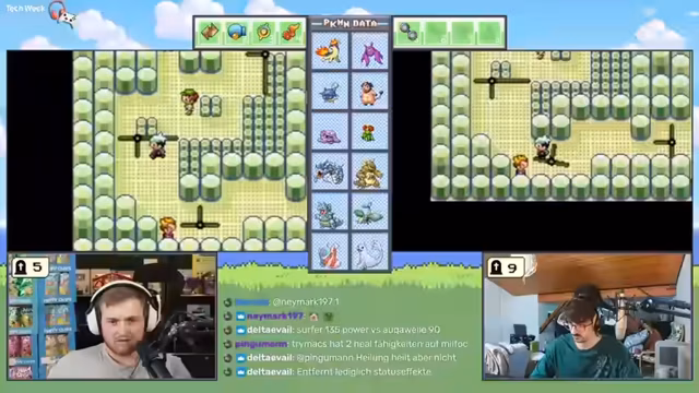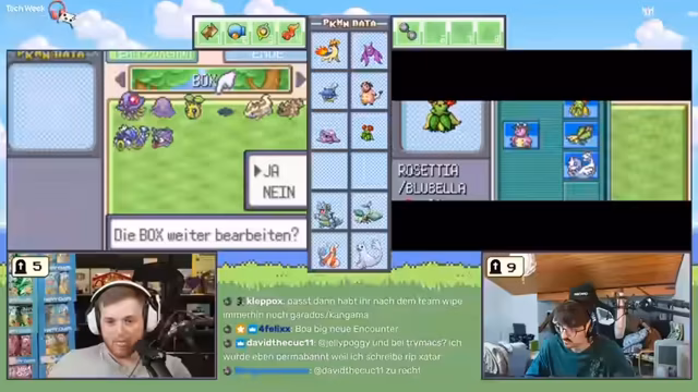 00:41:44Nach dem ausführlichen Thema Raumfahrt wechselt der Streamer zum angekündigten Pokémon-Spiel. rumathra und sein Mitspieler Max beginnen eine Locke-Challenge, bei der sie versuchen, das Spiel mit zufälligen Pokémon und Items zu meistern. Ihre Start-Teamkonfiguration ist stark, besonders der Slimer erweist sich als überraschend mächtig dank eines Bugs mit der Matschbombe, der extrem hohen Schaden verursacht. Die Strategie umfasst den Einsatz von "Raub", um zufällig generierte Items wie "Überreste" zu stehlen, was den Pokémon eine kontinuierliche Heilung pro Runde verleiht.
