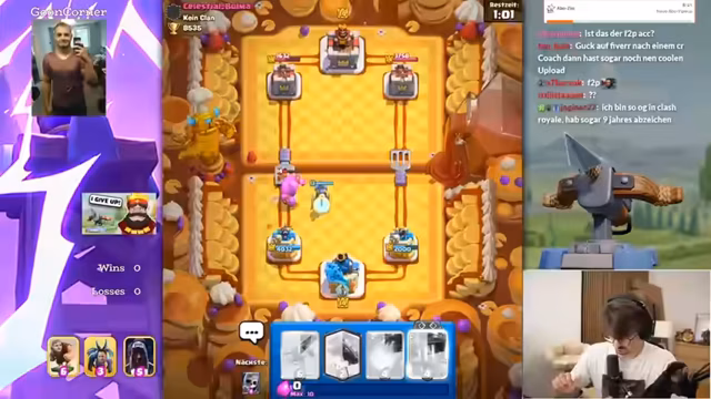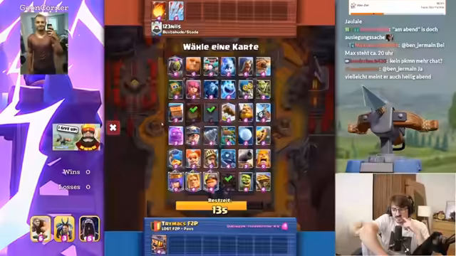 04:19:49Der Streamer stellt ein vorübergehend genutztes Deck vor und erklärt seine Strategie. Er erwähnt das Free-to-Play plus Pass Modell und zeigt, wie er mit eingeschränkten Ressourcen spielt. Er äußert seine Freude über den Evo-Ofen und andere seltene Karten, die er nur in bestimmten Matches einsetzt. Gleichzeitig zeigt er seine Unsicherheit in bestimmten Spielsituationen, insbesondere gegen bestimmte Karten wie den Hog Rider.