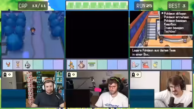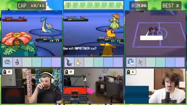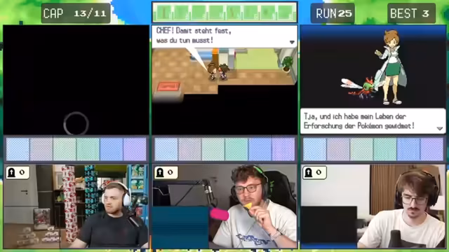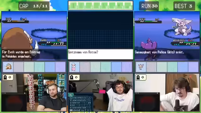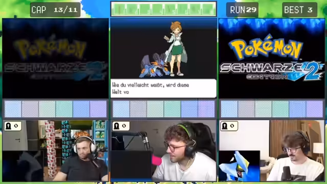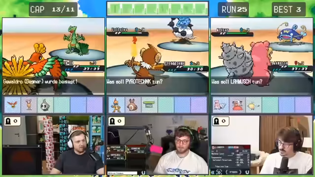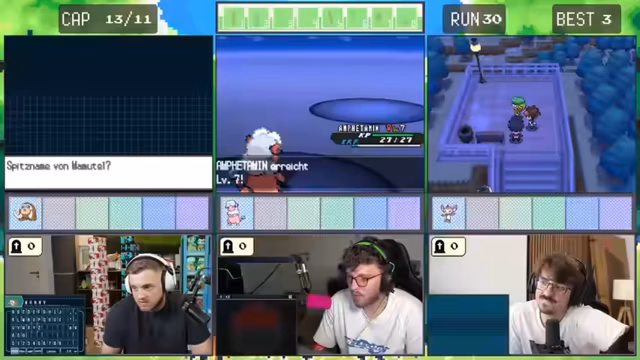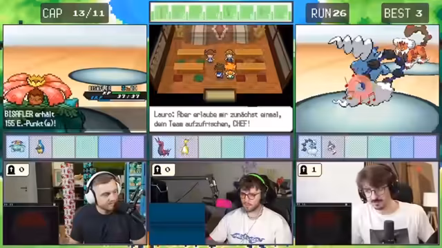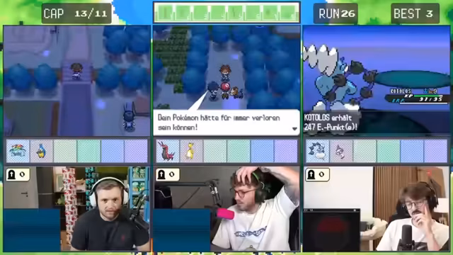 10:52:38Im weiteren Verlauf des Streams machen die Spieler Fortschritte im Spiel, aber sie treffen erneut auf herausfordernde Situationen. Sie kämpfen gegen Trainer mit stärkeren Pokémon und müssen ihre Strategien anpassen. Es kommt zu kritischen Momenten, in denen sie knapp besiegt werden oder wichtige Pokémon verlieren. Trotzdem bleiben sie motiviert und überlegen sich taktische Lösungen.