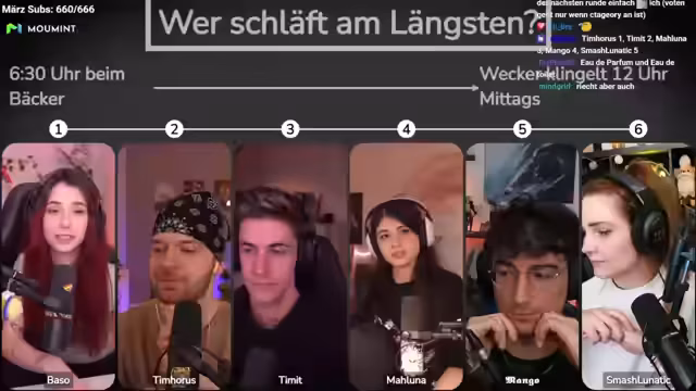 03:27:35Die Gruppe führt ein persönliches Ranking zu 'Wohlriechen' durch, bei dem Franzi den ersten Platz belegt. Es gibt technische Schwierigkeiten mit dem Chat-Voting, die jedoch schnell behoben werden. Der Streamer betont, dass zu viel Parfüm unangenehm sein kann und rät zur vorsichtigen Anwendung. Anschließend wird das Thema 'Schlafrhythmus' als nächste Kategorie für das Ranking vorgestellt.