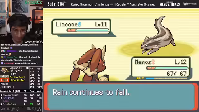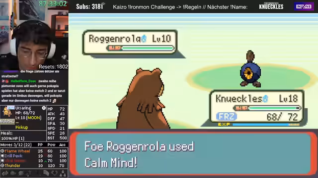 03:16:37Nach Abschluss der Rainbow Six Siege-Runde wechselt der Stream zum Spiel Pokémon Iron Man. Das Gameplay besteht aus dem Fangen und Trainieren von Pokémon in einem zufälligen Modus, bei dem die Stärken und Schwächen jedes Monsters neu festgelegt werden. Der Streamer macht sich auf die Suche nach einem starken Pokémon-Kandidaten, analysiert dabei dessen Stats, Attacken und Schwächen und trifft taktische Entscheidungen, ob er das Pokémon weiterentwickeln oder den Run bei schlechtem Zufall beendet.