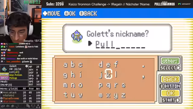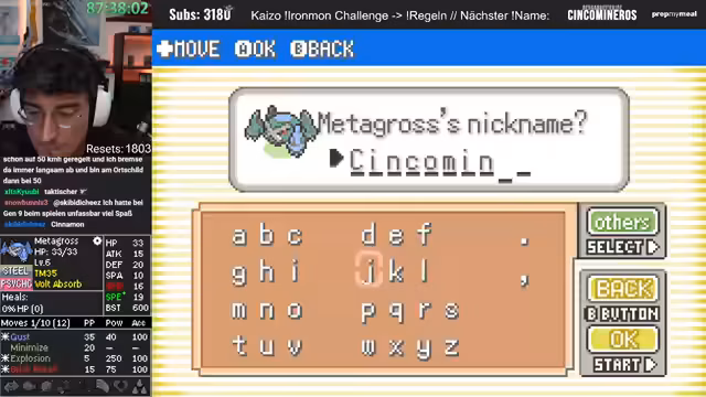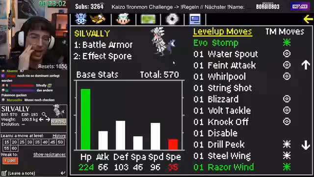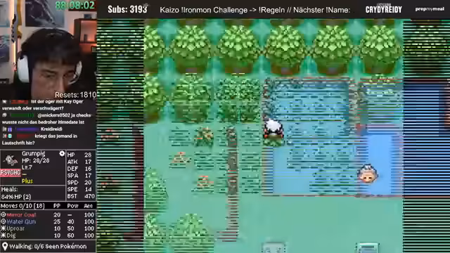 03:45:45Der Streamer beschreibt den aktuellen Stand seines Ironman-Laufes. Er hat ein gefangenes Pokémon, das aber noch nicht entwickelt wurde und dessen Moveset erst bei der Entwicklung festgelegt wird. Dies gibt ihm Flexibilität, sowohl für eine physische als auch eine spezielle Ausrichtung. Da das benötigte Entwicklungsitem, der Mondstein, noch nicht gefunden wurde, wird er den Run wahrscheinlich bei einem schlechten Reset-Zustand beenden, um die Chance auf ein besseres Pokémon zu wahren.