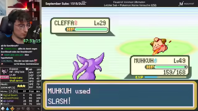 rvnxmango startet Pokémon Feuerrot nach dem Verlust von Scherox emotional neu. Ein überraschendes Scherox mit Farbwechsel und Signalstrahl erscheint, was als Zeichen gesehen wird. Strategien werden angepasst, um Roccos zu besiegen. Trotz anfänglichem Erfolgs endet der Run abrupt. Trypophobie, Spielschwierigkeiten, Lieblingspokémon Absol, Reset-Strategien und Shell Bell Fund werden diskutiert.