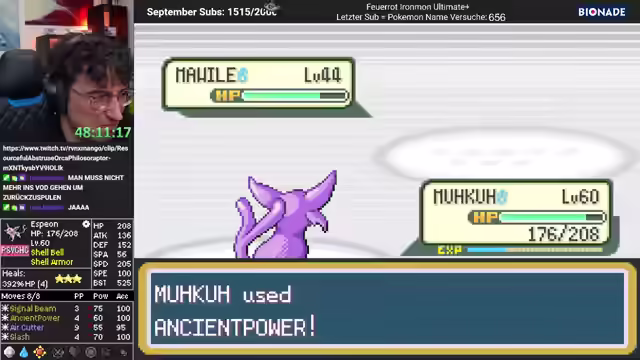 06:14:18Der Streamer findet eine Shell Bell, was das aktuelle Pokémon deutlich stärker macht. Er erinnert sich an den Verlust eines Scherox mit Flash-Fire und die Trauer im Chat. Ein neues Scherox mit Color Change und guter Natur wurde gefunden, was die Community beruhigte. Der Streamer überlegt, Signal Beam PP-Maxen zu lassen, da die Scope-Linse nicht mehr verwendet wird. Es werden verschiedene Items gefunden und sortiert. Der Streamer äußert Hoffnung für den aktuellen Run und bereitet sich darauf vor, Giovanni zu besiegen. Es wird überlegt, welche Attacken gegen Giovannis Pokémon eingesetzt werden sollen, und die Bedeutung von Crit-Treffern wird betont. Der Run endet jedoch tragisch, da das Pokémon an Abgangsbund scheitert. Der Streamer bedauert, dass er zu defensiv gespielt hat und nicht genug Schaden verursacht hat.