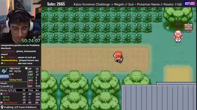 00:18:54Nachdem der Bot-Test für ausreichend befunden wurde, beginnt der eigentliche Ironmon-Run mit dem ausgewählten Serox. Der Streamer erläutert die Regeln des Kaizo-Modus: Das Starter-Pokémon wird zufällig vorgegeben und der Name des Pokémon muss im Chat gespendet werden, um es offiziell zu übernehmen. Der Run startet mit einem Magneton, das trotz guter Grundstats (hoher Spezialangriff) durch seine vierfache Schwäche und niedrige Verteidigung als sehr riskant eingestuft wird. Der Streamer bleibt jedoch optimistisch und gibt dem Run eine Chance.
