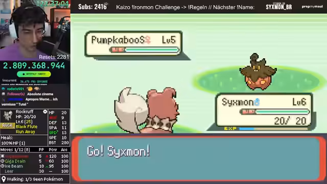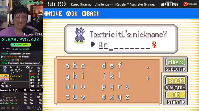 06:48:08Nach mehreren verlorenen Runs beginnt der Streamer einen neuen Versuch mit einem anderen Starterpokémon. Er überlegt, welches Pokémon er fangen soll und entscheidet sich für ein Rotom Ventilator, welches sich als vielversprechend erweist. Er beschreibt die notwendige Strategie und bittet im Chat um Unterstützung. Das Pokémon scheint mit Moves wie Rockslide und Drillpack ein starkes Potenzial zu haben, auch wenn es eine Range hat und ein Crit für den Sieg nötig wäre.
