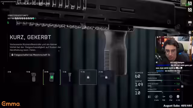 06:17:53Der Streamer konzentriert sich darauf, verschiedene Waffenaufsätze und Kombinationen zu testen, um seine Waffen zu optimieren. Er entdeckt, dass bestimmte Kombinationen wie ein zweiter großer Griff für sein MG die Leistung deutlich verbessern. Gleichzeitig diskutiert er die Vor- und Nachteile verschiedener Waffentypen und wie sie sich auf sein Gameplay auswirken.