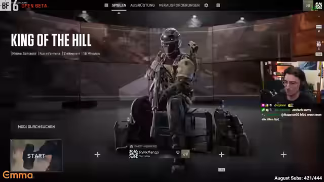 00:08:32Der Stream beginnt mit einer kleinen Verzögerung, da der Streamer technische Probleme beheben musste. Es wird direkt ins Battlefield-Spiel gewechselt, wobei ein neuer Spielmodus namens 'King of the Hill' getestet wird. Der Streamer äußert seine Freude über die Möglichkeit, neue Modi zu spielen, und erwähnt die geringe Chance, dass Captain Sammy in der Lobby erscheint könnte. Er diskutiert kurz über seine Hobbys wie Badminton und Beachvolleyball, bevor er mit dem Gameplay beginnt.