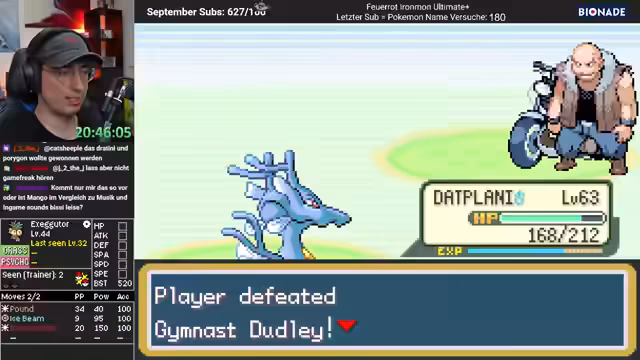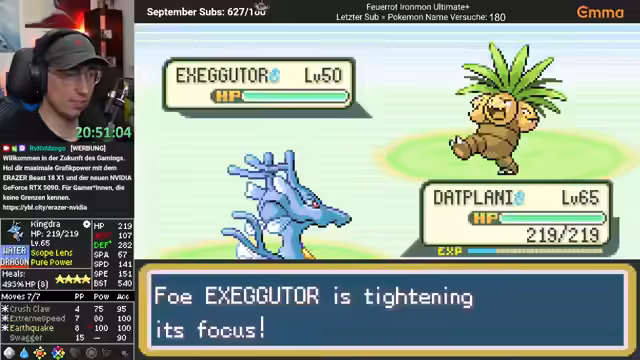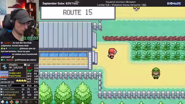 04:19:06Der Streamer setzt seinen Pokémon Feuerrot Ironmon-Slot fort. Er hat Giovanni bereits besiegt und ist nun auf dem Weg zu Sabrina. Er und sein Team sind dabei überlevelt, was den Kampf erleichtert, aber er hat Bedenken bezüglich der Stärke seines Seedra-Kämpfers. Nach dem Kampf kündigt er einen Rückzug ins Labor an, um Pokémon auszutauschen.