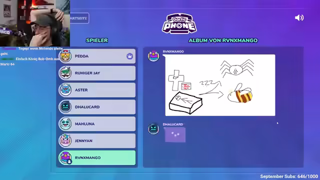 02:23:05Das Spiel Gartic Phone beginnt mit ungewöhnlichen Regeln, bei denen die Mitspieler vorgegebene Begriffe zeichnen und die anderen erraten müssen. Der Streamer ist sich seiner eigenen Schwächen bei der Zeichnung und der Erklärung ohne verbotene Wörter bewusst. Die Runde startet unter chaotischen Umständen, da technische Schwierigkeiten und das Ignorieren von Regeln zu absurden Darstellungen führen, was den humorvollen Charakter der Runde unterstreicht.