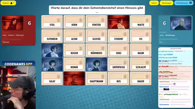 03:46:02Die Gruppe diskutiert über mögliche Verbindungen zwischen den Wörtern im Spiel Codenames, wobei Nürnberg als schwieriger Begriff identifiziert wird. Es wird überlegt, ob ein Zusammenhang zu Tee oder Früchten besteht, und verschiedene Optionen wie 'Essensglocke' und 'Baum' werden in Betracht gezogen. Nach einer Kommunikationspanne, bei der der Streamer kurz stummgeschaltet war, werden die vorherigen Überlegungen zu 'Bau' und 'Schlacht' sowie die Schwierigkeit, 'Kernglocke', 'Nürnberg' und 'Untertasse' zu verbinden, erörtert. Frühere Gedankengänge zu 'Früchtetee' und die unbemerkte Bedeutung von 'Baum' als schwarzes Wort werden analysiert. Die Überlegung, wie 'Glocke' mit 'Früchtetee' in Verbindung gebracht werden könnte, führt zu der Idee einer Früchteglocke oder Haube. Abschließend wird überlegt, ob es eine 'Tee-Glocke' gibt und ob 'Baum' die bessere Wahl war. Die Gruppe plant eine weitere Runde und teilt die Teams zufällig ein.