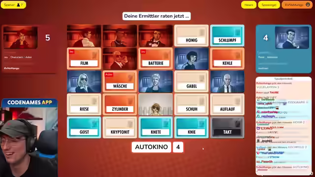 04:00:49Das Team analysiert die Bedeutung von 'Vogelarten' und überlegt, ob es spezifische Vogelarten gibt, die zu den anderen Begriffen passen, wie z.B. 'Schlameise' oder 'Honigdrossel'. Die Assoziation von 'Kehle' mit 'Rotkehlchen' wird als möglicher Hinweis erkannt. Es wird diskutiert, ob man die nächste Runde mit zusätzlichen Begriffen riskieren soll, und die Idee, den Spielleiter direkt nach der Bedeutung der Begriffe zu fragen, wird verworfen. Die Gruppe entscheidet sich für 'Moor' und hofft, dass die Gegner scheitern. Die offensichtliche Verbindung von 'Schlamm' wird erkannt, und es wird überlegt, ob 'Nebel' gemeint sein könnte. Die Gruppe diskutiert über die Denkweise des Spielleiters und entscheidet sich letztendlich für 'Nebel' und 'Schweif', wobei 'Schweif' als das schwarze Wort entlarvt wird. Es folgt eine Analyse der verbleibenden Begriffe 'Film, Batterie, Wäsche, Zylinder' und deren Verbindung zum Thema Auto. Es wird überlegt, ob es in neueren Filmen prominente E-Autos gab, und verschiedene Assoziationen zu 'Koch' und 'Pfanne' werden diskutiert. Die Gruppe klickt 'Strom' und 'Pfanne' an und überlegt, ob der 'Italien-Schuh' (Geografie) eine Option wäre. Die Diskussion dreht sich um 'Autowäsche' und 'Autopflege', und es wird überlegt, ob man zwei Zweier- oder einen Dreierbegriff wählen und einen Begriff raten soll. Die Gruppe analysiert die Begriffe erneut und kommt zu dem Schluss, dass 'Schwanzfedern' zu 'Vogelschweif' passen könnte. Es wird überlegt, ob 'Kino' mit 'Superman' und 'Kryptonit' oder mit den 'Schlümpfen' in Verbindung steht, und die Bedeutung von 'Zylinder' wird im Kontext von Autos berücksichtigt. Die Gruppe klickt 'Batterie' und 'Zylinder' an und diskutiert, ob 'Wäsche' oder 'Kryptonit' die bessere Wahl wäre. Letztendlich wird entschieden, zuerst 'Kehle' anzuklicken, um den Gegnern keine Möglichkeit zu geben.