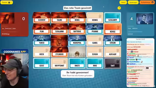 03:50:53Nach Abschluss der vorherigen Runde startet eine neue Runde Codenames. Die Teams werden neu eingeteilt. Die Streamerin wird auf das rote Team gesetzt, das die Wörter Schweif, Taube, Nebel, Film, Schlamm, Batterie, Wäschezylinder und Kehle zuordnen muss. Gemeinsam überlegen sie sich Verbindungen zwischen den Wörtern, wobei Vogelarten im Vordergrund steht, da Taube und Kehle (Rotkehlchen) starke Hinweise sind.