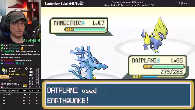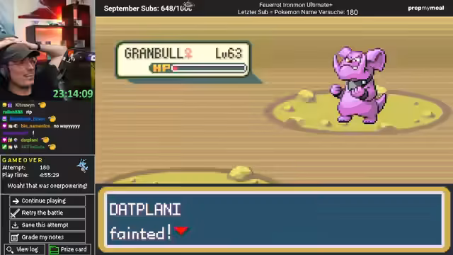 01:22:17Das Gameplay konzentriert sich auf den Ironmon-Modus von Pokémon Feuerrot, wobei der Streamer auf knifflige Situationen wie einen schwierigen Kampf gegen ein Donphan auf Level 53 reagiert. Die Herausforderung besteht darin, mit limitierten Ressourcen wie PP (Power Points) auszukommen, da das Team stark unterleveled ist und keine Shellbell zum ständigen Heilen hat. Die Strategie ist, Gegner schnell zu besiegen (One-Shotten), was aber durch gegnerische Attacken wie Abgesang, die das eigene Pokémon sofort sterben lassen, verkompliziert wird.