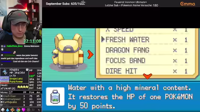 01:34:56Es wird erwartet, dass die aktuelle Arena aufgrund des geringen Schadens schwierig wird und die Heilitems aufgebraucht werden. Es wird überlegt, wie man die Arena am besten bewältigt, da die Gegner nicht mehr mit einem Schlag besiegt werden können. Ein Crit wird genutzt und die Earthquakes werden eingesetzt. Gelbe Flöten werden als taktisches Mittel eingesetzt, um Gegner zu beeinflussen. Der Seed des Spiels wird als problematisch angesehen, da scheinbar kein anderes Pokémon in diesem Seed gut ist. Das Fehlen einer Shellbell erschwert das Durchheilen zusätzlich. Es wird überlegt, ob man vor den Top 4 aufhört, da der Seedra King überraschend gut performt.