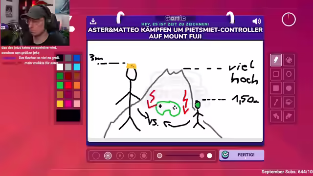 02:42:18Die Gruppe spielt eine Runde Gartic Phone, wobei die Zeichnungen und deren Interpretationen für einige Verwirrung und viele Lacher sorgen. Peter wird in einer Zeichnung als generischer NPC dargestellt, was zu amüsierten Kommentaren führt. Eine andere Zeichnung zeigt Asta mit Bier vor einer Gummipuppe, was zu witzigen Spekulationen Anlass gibt. Es gibt auch eine Diskussion über die korrekte Darstellung von Peters Bart, der in einigen Zeichnungen als rote Pickel dargestellt wird. Eine Zeichnung von Mango im Anzug wird mit Agent 47 verglichen, während eine andere die Teilnehmer vor die Aufgabe stellt, Beatsmeet-Controller auf dem Mount Fuji zu zeichnen. Die Runde endet mit der Aufgabe, Kriegsverbrechen im Kosovo zu visualisieren, was zu einigen verstörenden, aber auch humorvollen Ergebnissen führt. Die unterschiedlichen Zeichenstile und Interpretationen der Teilnehmer tragen zur Unterhaltung bei und sorgen für viele unerwartete Wendungen.