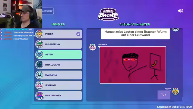02:26:28Nach dem erfolgreichen Neustart läuft das Spiel weiter. Die Zeichnungen sind äußerst kreativ und teils absurd, was zu verschiedenen Interpretationen im Chat führt. Besonders die Zeichnung von Peter, die fälschlicherweise als Pizza-Victory gedeutet wird, und die Darstellung von Astar mit Brüsten sorgen für humorvolle Verwirrung und Unterhaltung.
