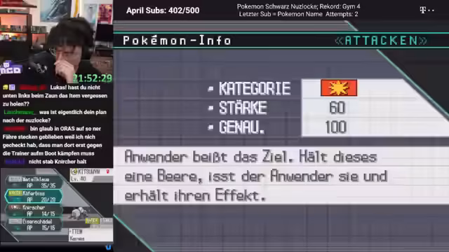 Nach einem Nuzlocke-Run voller Rückschläge und strategischer Opfer wurde das Finale in Pokémon Schwarz erreicht. Das stark dezimierte Team konnte den finalen Boss besiegen. Anschließend wurden neue Pokémon für den Kampf in der Poké Liga integriert, bevor ein technisches Problem den Spielabbruch erzwang.