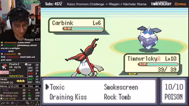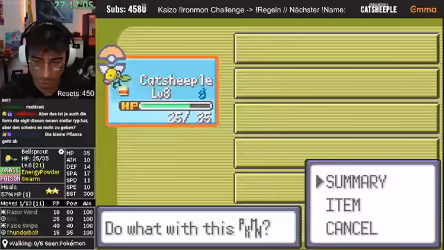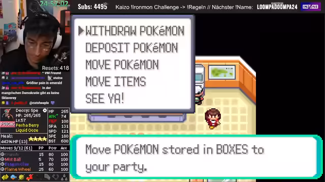 00:14:12Nachdem technische Vorbereitungen wie das Synchronisieren von Timer und Audio abgeschlossen sind, beginnt der Ironmon Kaizo Run. Ein zentrales Pokémon der Session ist ein Deoxys, dessen Stats anfang vielversprechend erscheinen. Der Streamer kämpft mit der Statverteilung, besonders dem zu hohen Speed und zu niedrigen Angriff, was die Wirksamkeit der Attacken stark einschränkt. Trotz hektischer Kämpfe und des Einsatzes von Items stirbt das Deoxys schließlich, eine Entscheidung, die die Community mit Subs kommentiert, was als Ironie gesehen wird.
