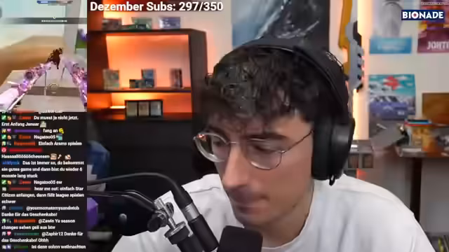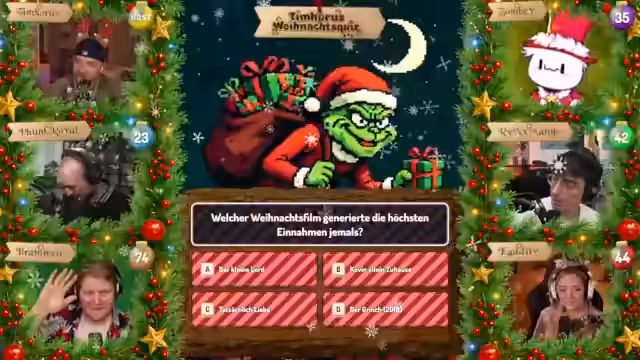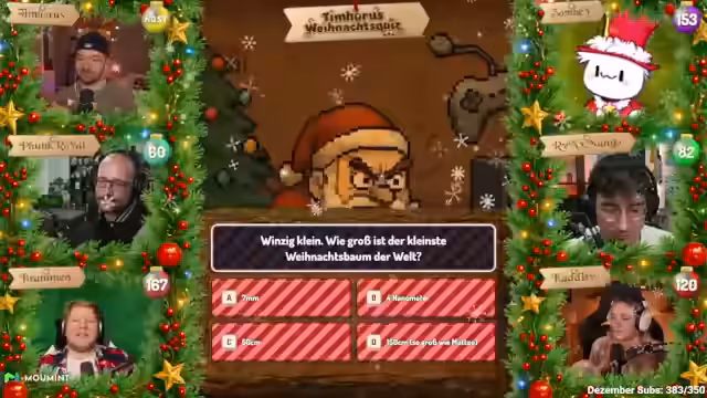 08:50:18Zwischenstand des Weihnachtsquizzes wird bekannt gegeben: Brammen führt mit 74 Punkten, gefolgt von Zombey (153), Kaddi (144), Mango (106) und Funk Royale (60). Ein technischer Vorfall führt zu einer unerwarteten Unterbrechung, als ein Alert für Abo-Geschenke mit unpassendem Bildmaterial eingeblendet wird.