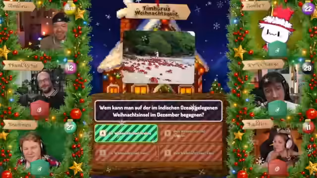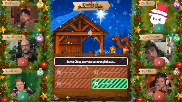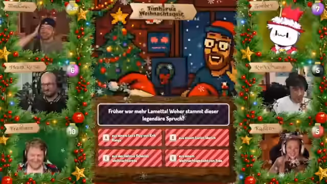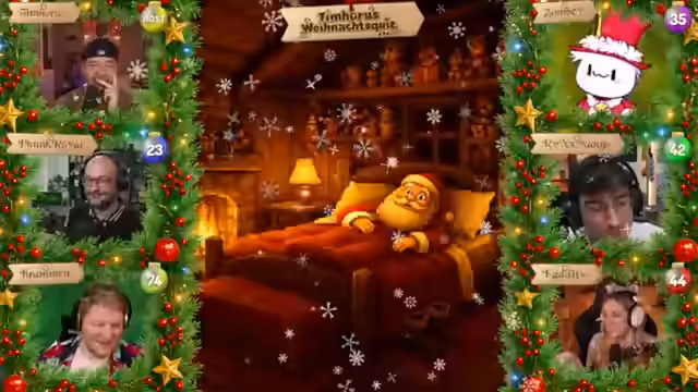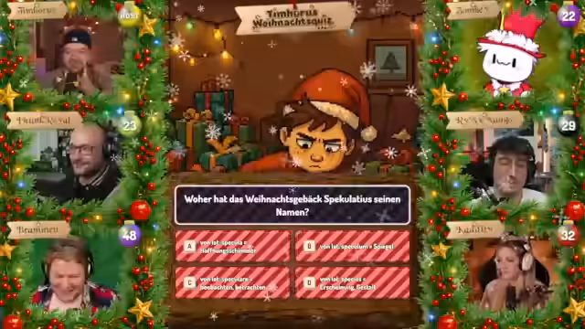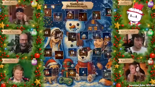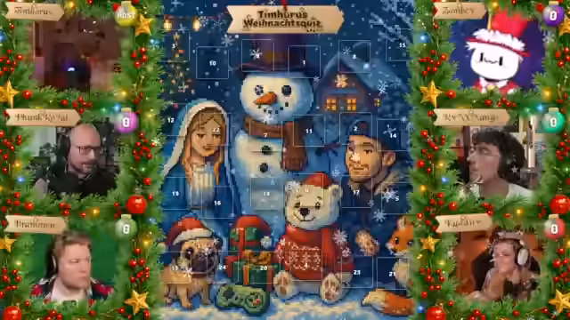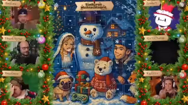 07:28:22Tim Hohos eröffnet die zweite Ausgabe seiner Weihnachtsshow und begrüßt die Gäste Funkroyal, Braben, Zombie, Mango und Kaddi. Er stellt das Adventskalender-Format vor: Hinter jedem Türchen verbirgt sich eine Multiple-Choice-Frage (A-D). Die Zuschauer wählen auf ihrer persönlichen Player-Seite eine Antwort aus und sammeln Punkte, wobei Türchen 1 einen Punkt und Türchen 24 maximal 24 Punkte bringt. Das Spiel ermöglicht es den Teilnehmern, durch spätere Türchen aufzuholen, falls sie anfangs schlecht abschneiden. Die Antworten werden über die Player-Seite eingereicht, die zusätzlich Bilder oder Kontextinformationen enthält, und können bis zur Sperrung geändert werden.
