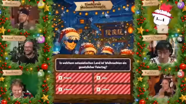 07:57:56Türchen 5 erkundigt sich nach dem ostasiatischen Land, in dem Weihnachten Feiertag ist (A: Mongolei, B: Japan, C: Südkorea, D: Thailand). Nach einer Diskussion über kulturelle Besonderheiten wie KFC-Essen in Japan wird C (Südkorea) als Lösung genannt, wo 30% der Bevölkerung christlich sind. Anschließend wird ein Easter Egg auf der Player-Seite enthüllt: Durch Ändern der Farbe auf 100 wird ein 'Rainbow Mode' aktiviert, der zusätzliche Reaktionen auslöst. Spieler nutzen dies für interaktive Farbexperimente.