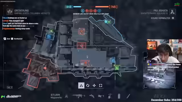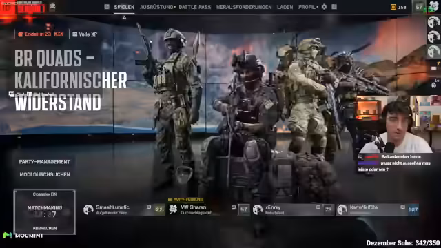 00:36:46Die Gruppe diskutiert die Regeln: Controller-Spieler dürfen nicht während Matches wechseln. Der Streamer selbst wechselt von Controller zu Maus/Tastatur, nachdem er drei Wochen lang Third-Person gespielt hat. Waffenstrategien werden besprochen: KTS als favorisierte Waffe, SGX/USG für Close-Range und SVK als DMR. Sie planen, zwei Pioniere und zwei Aufklärer zu spielen, um Munition und Panzerabwehr zu sichern. Beladen wird über Favoriten im Loadout-Menü, um schnell auszuwählen.