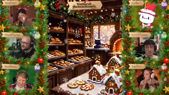 09:28:37Finale Punktestände: Funk Royale (60), Mango (106), Kaddi (144), Zombey (153), Brammen (167). Der Stream endet mit gemeinsamen Verabschiedungen, Weihnachtsgrüßen und dem Ausdruck von Zufriedenheit über den entspannten, gemütlichen Abend. Es wird auf die unkomplizierte Atmosphäre des Formats hingewiesen.