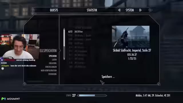 02:48:40Nach einer Unterbrechung kehrt der Streamer zu einem früheren Spiel zurück und sucht den richtigen Vibe, bevor er zu Skyrim wechselt. Er beginnt mit der Erkundung des Hauptspiels und hat gerade den ersten Boss besiegt. Die Absicht ist, eine Nebenaufgabe zu starten, während er auf das Eintreffen seiner Begleiterin Lydia wartet. Der Streamer zeigt sich beeindruckt von der Detailtiefe und der Anzahl der zufälligen Ereignisse, die im Spiel stattfinden, und betont, wie sehr dies das Spielerlebnis verbessert. Er führt auch eine kleine Quest zur Drachenruine durch und stellt fest, dass viele Kommentatoren ihn in die Dunkle Bruderschaft führen möchten.