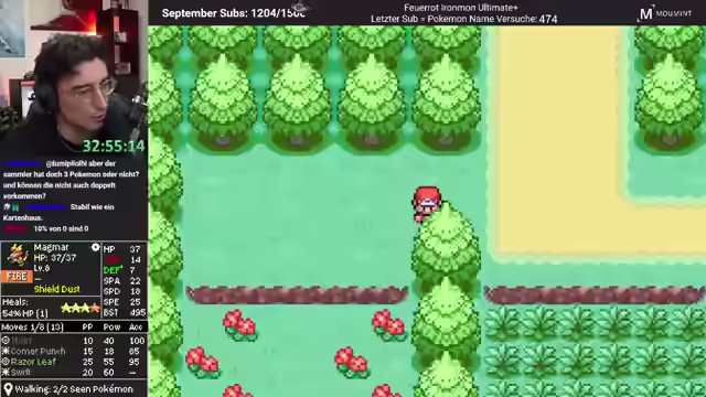 02:55:30Es wird sich bei Archeron für das Sponsoring bedankt und auf den laufenden Playtest hingewiesen, der bis 23 Uhr läuft. Eine weitere Session ist für die kommende Woche geplant. Der Streamer verabschiedet sich von den Mitspielern und bedankt sich für den Spaß. Nach einer kurzen Toilettenpause wird der Stream mit Pokémon Feuerrot Ironmon fortgesetzt. Es wird die Frage aufgeworfen, ob Stahlos eine gute Wahl war. Nach der Analyse der Werte und Fähigkeiten von Stahlos wird festgestellt, dass es leider ungeeignet ist. Trotz des Bedrohers und einiger guter Attacken sind die Death-Werte zu schlecht verteilt. Es wird entschieden, Stahlos nicht zu verwenden und stattdessen nach einem besseren Pokémon zu suchen. Die Suche nach einem geeigneten Pokémon für den Ironmon-Run wird fortgesetzt, wobei verschiedene Kandidaten analysiert und verworfen werden. Es werden Favoriten für zukünftige Versuche festgelegt, wobei darauf geachtet wird, keine Legendären Pokémon zu bevorzugen.