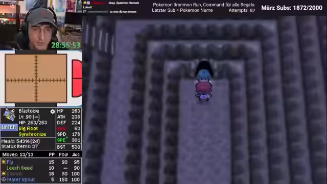 03:46:28Der Streamer kämpft gegen Trainer und fängt neue Pokémon. Er ist erleichtert, als eines seiner Pokémon einen gefährlichen Angriff überlebt. Er diskutiert die Nutzung von Leech Seed als Strategie in mehreren Kämpfen. Er trifft auf ein neues Pokémon, Monstrat, und kann es nach einem harten Kampf fangen. Er ist zufrieden mit dem Verlauf des Spiels und geht davon aus, dass einige seiner Pokémon im weiteren Verlauf einen Pflichtauftritt haben werden.