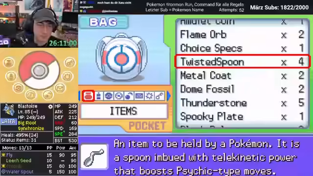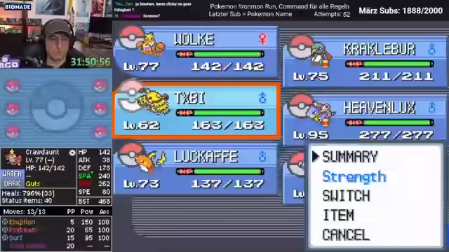 06:28:55Streamer verteilt die finalen Attacken und Items auf seine Teammitglieder. Er entscheidet, welche Pokémon welche Attacken erhalten und verteilt Fokus-Sash, Bright Powder und andere Items, um seine Teammitglieder zu stärken. Er stellt sicher, dass jedes Pokémon das Beste aus seinen Fähigkeiten herausholt und fügt Medikamente und andere hilfreiche Gegenstände hinzu, die während der Kämpfe benötigt werden.