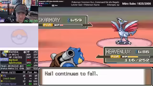 06:59:00Leech Seed wird gegen Aaron eingesetzt. Luxtra wird als gemein empfunden. Es wird Leech Seed eingesetzt, um den Gegner ins Rote zu ziehen und ein Heal zu erzwingen. Minimize wird eingesetzt. Es wird gehofft, dass Block ausläuft. Crunch wird eingesetzt. Egelsamen wird als MVP bezeichnet. Die erste Maßnahme ist, eine Sinobeere zu suchen. Die zweite Maßnahme ist, eine Lepperberry zu suchen. Joey wird besiegt. Albtraum Dialga hat keine guten Attacken. Kangama wird mit Leech Seed bepflanzt. Geradax wird mit Waterfall besiegt. Zwei von vier sind besiegt. Crunch und Waterfall werden aufgefüllt. Xatu wird in Hilfe passen. Der dritte Gegner wird besiegt. Leech Seed und Crunch werden wieder aufgefüllt. Der letzte Gegner vor Cynthia wird erreicht. Cynthia wird mit Turtok angegriffen. Shuckle kommt als erstes. Sword Stance wird eingesetzt. Baton Pass wird eingesetzt. Turtok steckt das Ding weg. Leafsix wird eingesetzt. Philippa wird mit Shadow Force besiegt. Regerock ist das letzte Pokémon. Cynthia ist tot. Der Run war von Glück geprägt. Turtok war von Anfang an insane von den Werten her. Pokoros hat das gesamte Early gecarried. Der Streamer bedankt sich für den Support.