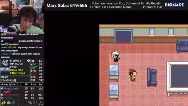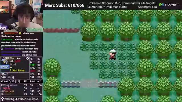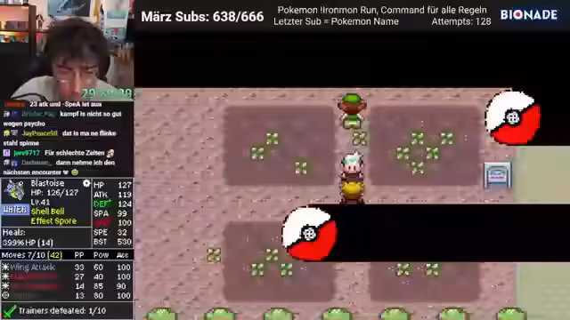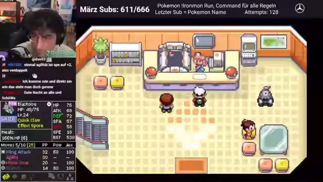 05:07:44Nachdem das Training für Geoguessr beendet ist, wechseln die Streamer zu ihremPokemon Ironmon-Spiel. Sie erleiden einen Rückschlag, als ihr Pokémon 'Shuckle' durch zu hohe Angriffs- und Spezialangriffswerte geschwächt wird und stirbt. Auch ein weiteres Pokémon, 'Tauros', verliert im Kampf. Der Streamer analysiert die Fehler in der Teamzusammenstellung und stellt fest, dass zu langsame Pokémon ein großes Problem darstellen. Er muss dringend ein schnelleres Pokémon finden, um fliehen und weitere Kämpfe erfolgreich zu gestalten.