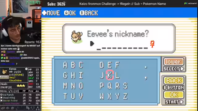 00:14:05Nach technischen Vorbereitungen startet das Gameplay im Pokémon Emerald. Der Streamer führt die Zuschauer an die Stelle zurück, an der der letzte Stream endete, und beginnt mit den Resets, um ein geeignetes Pokémon für die Ironmon-Challenge zu finden. Dabei nutzt er verschiedene Bälle und gibt Kommentare zu den Stat-Werten und den Attacken der gefundenen Pokémon, um die Chancen im Kampf einzuschätzen.
