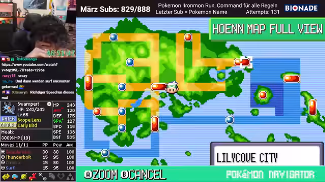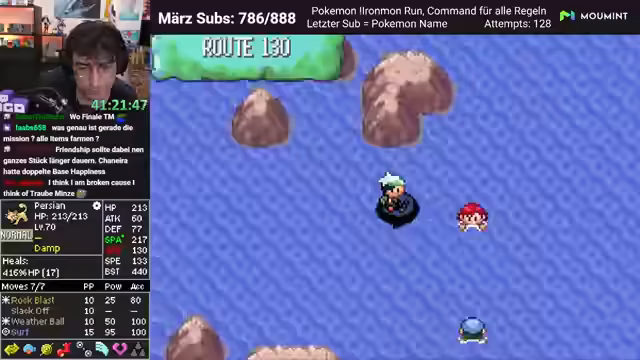 00:48:29Der Streamer überlegt, Double Tail Glow, Surfer und Nachteil einzusetzen, was jedoch riskant ist, da er sich in jedem Kampf neu aufstellen muss. Er sucht nach Items auf Route 133, vermeidet aber Kämpfe wegen der Gefahr durch Dornen. Er erinnert sich daran, dass es in der Küstenhöhle bei Ebbe versteckte Items geben könnte, und sucht diese ab. Er plant, die zwei versteckten Items zu holen, die er verpasst hat, in der Hoffnung, eine Herzschuppe zu finden. Er setzt Schutz ein, um nicht von Team Magma überrascht zu werden. Der Streamer entdeckt einen Wasserstein und überlegte, ob Billy Cut noch etwas lernen kann. Er muss jeden Kampf vorbereiten und auf TMs in der Siegestraße hoffen, da er Kaskade vergessen hat. Er hat sich etwas Begleitnahrung geholt und erinnert sich daran, dass er die Arena noch nicht gemacht hat und eine Arena TM bekommen wird. Er fragt sich, ob Billy Cut diese verwenden kann.