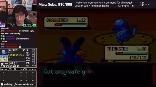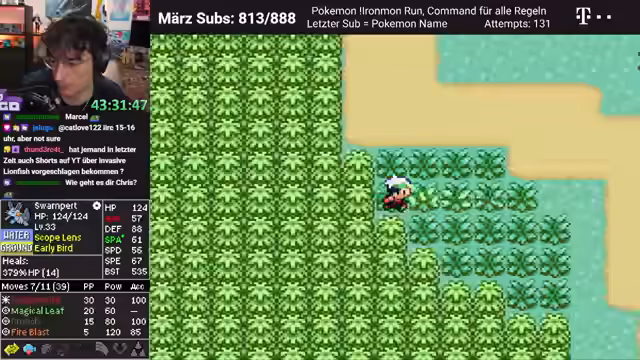 03:08:16Es wird überlegt, ob sich Alpollo irgendwann entwickeln wird. Alle Pokémon, die auf Tausch basieren, entwickeln sich hier mit dem Level. Es wird kein Pokémon gefunden, das sich für den XP-Teiler eignet. Der König stirbt. Es wird überlegt, ob man aktiv nach einem Pivot suchen sollte. Eistrahl wäre eine gute Attacke, da sie sowohl Drache als auch Feuer-Coverage bietet. Ein Morabel wird angetroffen. Der Streamer ist voll mit Items. Bälle und Schütze werden erworben. Es ist Arena-Zeit. Der Streamer redet über Snowbellycut. Es wird überlegt, ob man knirschen statt doppelkämpfen sollte. Das zweite Groudon ist der Endgegner. Der Streamer überlegt, wie er gegen ein Petal Dance Groudon ankommen soll. Surfer muss Karin lernen. Der Streamer wird von einem Spark getroffen. Im letzten Run wurde nicht ein Graudon gesehen und jetzt sowas. Grizzly ist gestorben. Der Streamer wird von einem Pokémon mit einer Zitrobeere angegriffen. Der Streamer setzt auf Doppelkick Spam und hofft auf Crit.